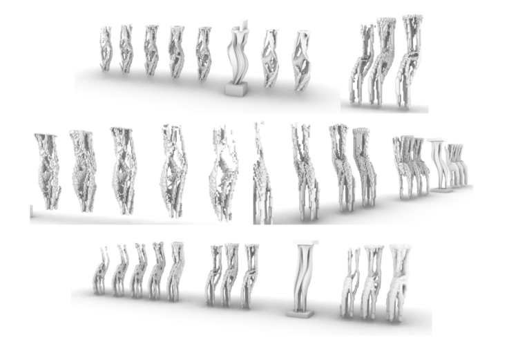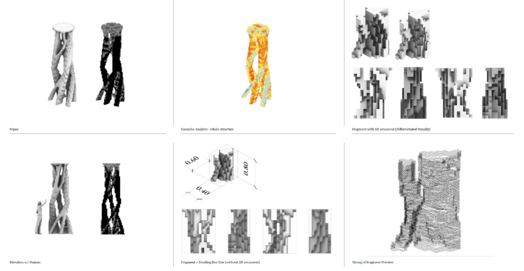 During this seminar new digital design methods and conceptual framework of early-design stage rationalization were explored. Using tectonic shape of a column as a architectural archetype for a case study, students firstly developed spatial structures using the Karamba plugin. These structures were rationalized into voxel geometry using topological optimization. A software tool for XR (Extended Reality) visualization Fologram was subsequently used to adapt the geometry in a sub-area and to analyze it statically and constructively. The optimized geometry was printed and fired in a ceramic 3D printer (collaboration Keramikstudio Die Angewandte).