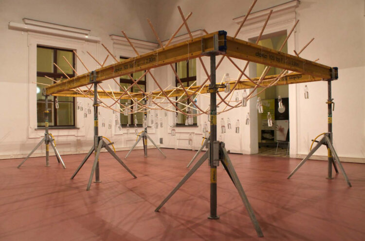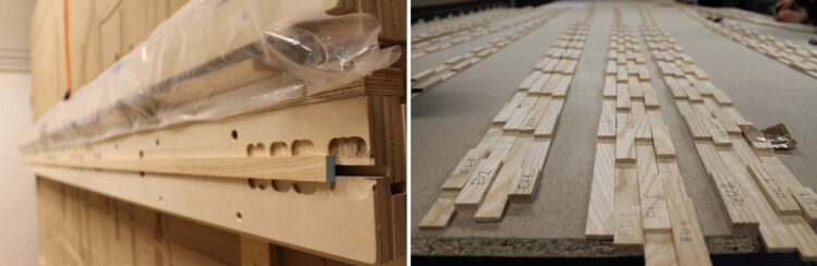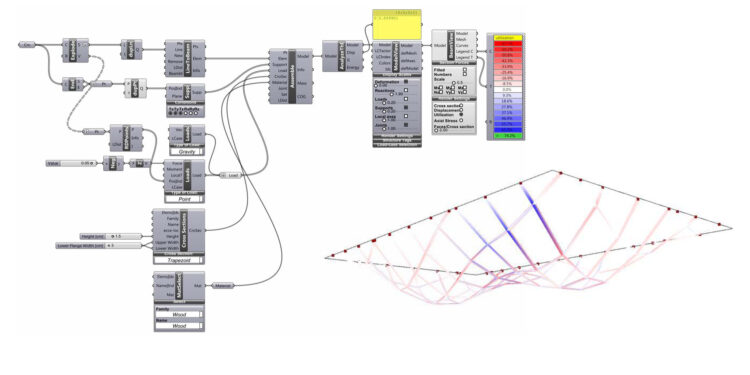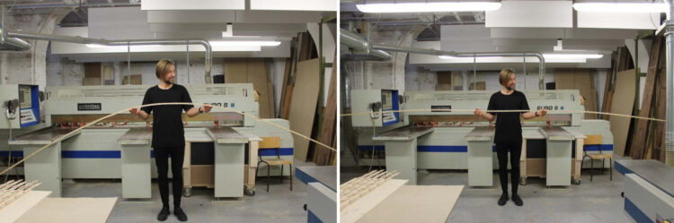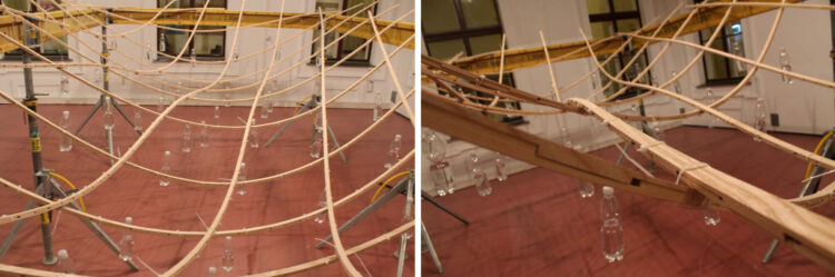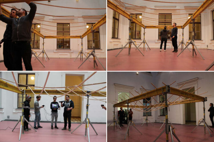 During a 5‑day long course students focused on the creation of controllable, dynamic, active-bending timber structures using loads as the actuators. The participants experimented with linear wooden elements (laths), where the overall deformation of the system is defined by the milled geometry between them. The course combined digital simulations for form finding (Kangaroo) and structural analysis (Karamba) with physical prototypes fabricated by robotic milling. The final outcome is a 1:1 grid-shell structure fabricated in flat pieces and later self-assembled into a double curved surface under the applied loads.