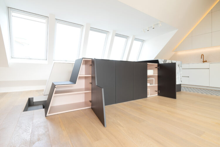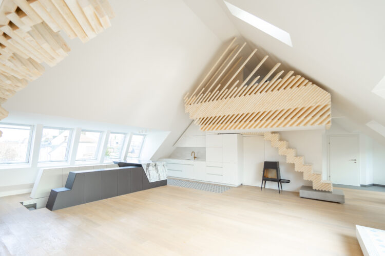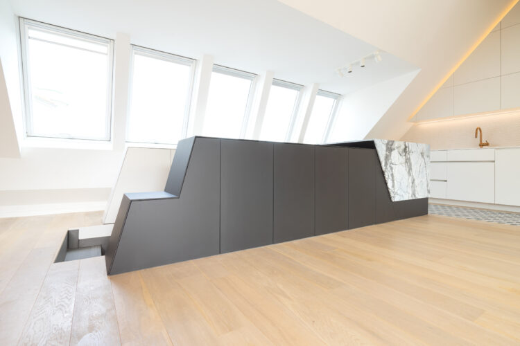 Es war einmal…Es war einmal ein bereits ausge­bau­tes Dach­ge­schoss, das Eltern von Kindern klar trennte. Diese Ausgangs­ba­sis wurde beibe­hal­ten, aber gleich­zei­tig dem Wunsch entspro­chen, eine ästhe­ti­sche und prak­ti­sche Verbin­dung zu schaf­fen, zusätz­li­che Raum­funk­tio­nen zu gewin­nen und den groß­zü­gi­gen Zwischen­raum multi­funk­tio­nell zu gestal­ten und zu einem Ort der Begeg­nung zu machen.