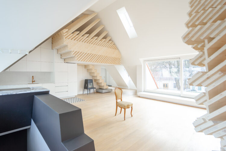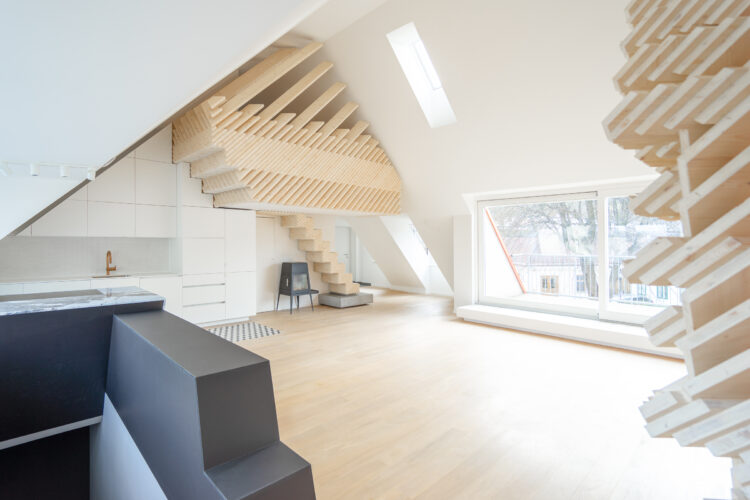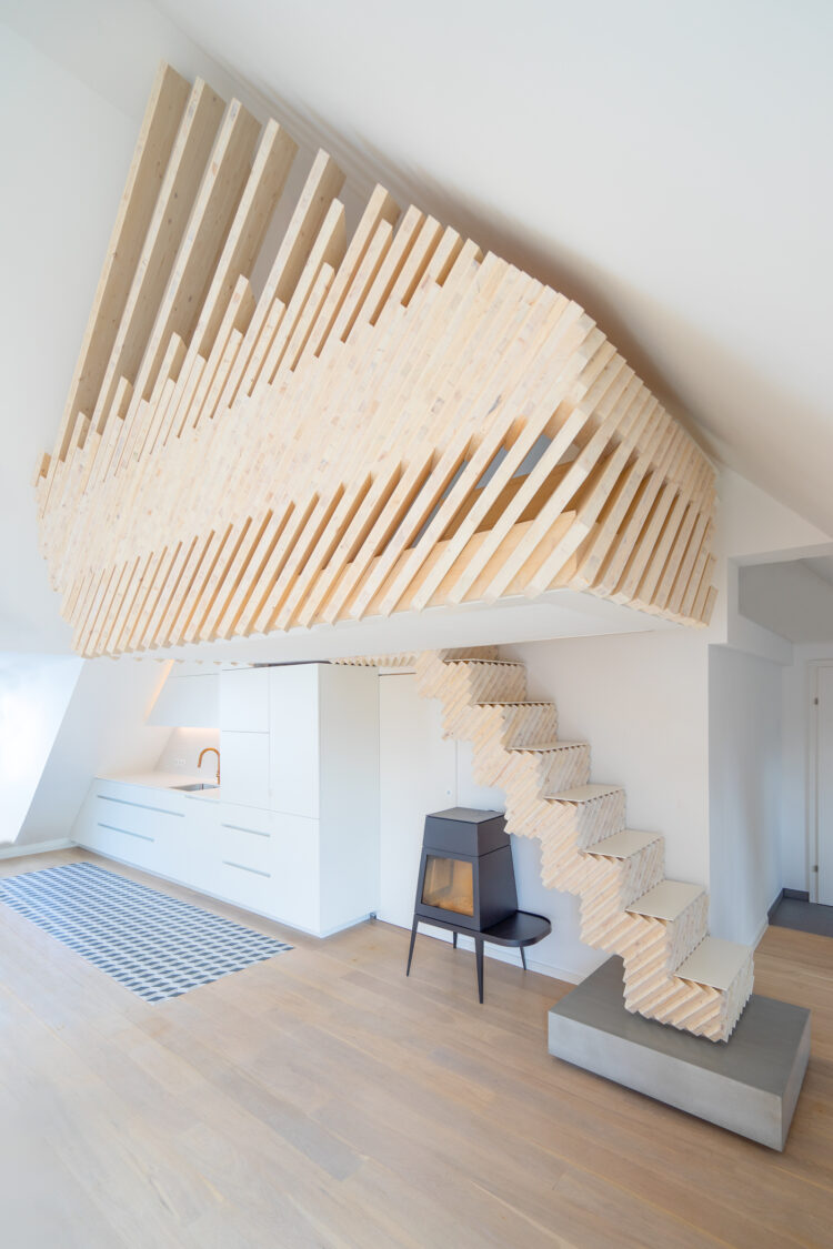 Auf der Eltern­seite wurde ein neuer Arbeits­raum und auf der Kinder­seite ein raum­ho­hes Bücher­re­gal geschaf­fen, welches durch die Puzzle-Stru­­­­­­k­­­­­­­tur alle Blicke auf sich zieht. Dahin­ter entstand ein Raum der Entspan­nung. Durch den “Puzzle Link“ wurde das bestehende Dach­ge­schoss zu einem Ort der Begeg­nung, der Wärme und der Viel­sei­tig­keit, in dem nach­hal­tige Mate­ria­lien und unter­schied­li­che Raum­funk­tio­nen eine wich­tige Rolle spie­len und eine große Bühne bekom­men.