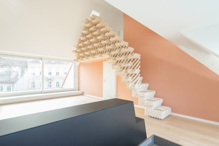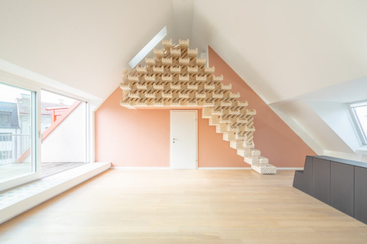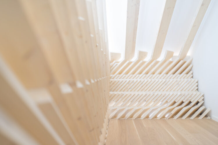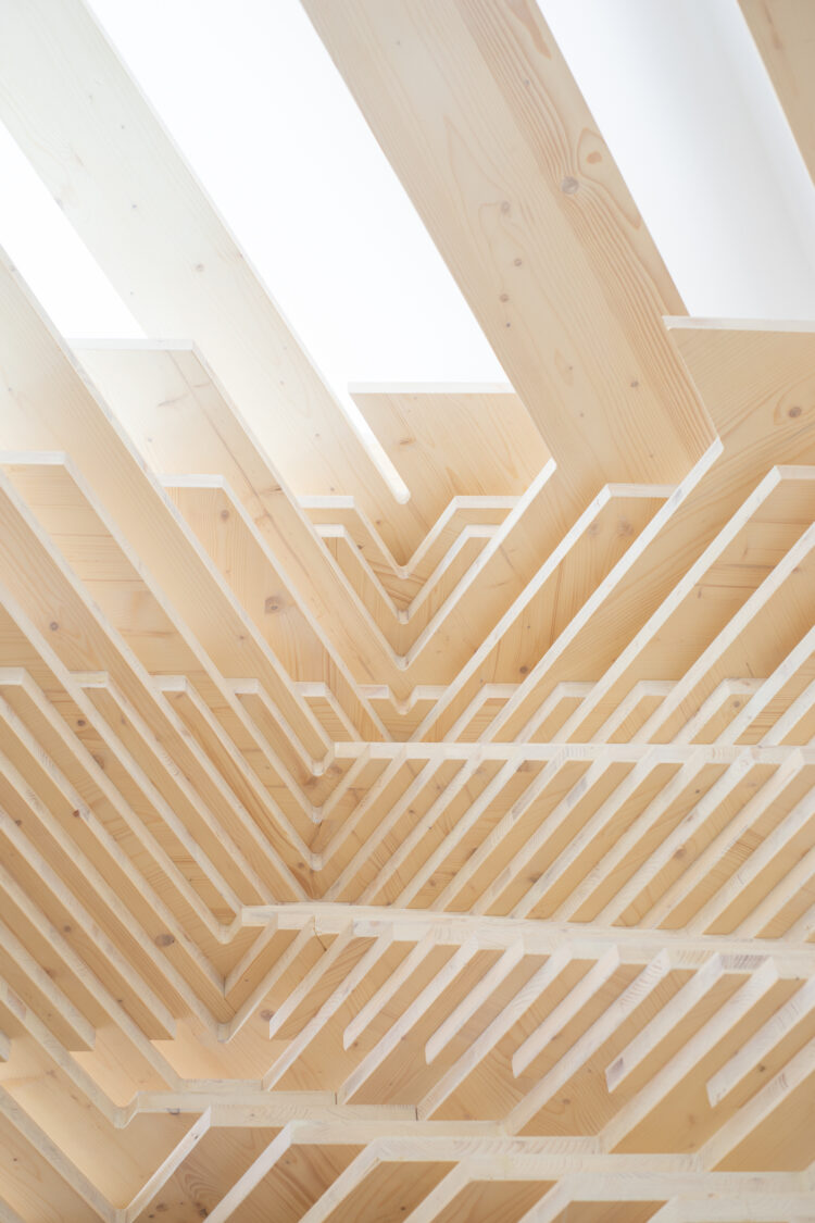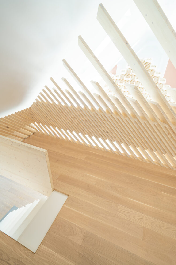 Durch den nach­hal­ti­gen Baustoff Holz wurde der ursprüng­li­chen Substanz des Dach­ge­schos­ses Wärme hinzu­ge­fügt. Die Erker wurden digi­tal entwor­fen und mittels einer CNC Fräse aus klei­nen Holz­tei­len herge­stellt. Diese Elemente stel­len den „Puzzle Link“ dar, welcher aus 698 indi­vi­du­ell gefer­tig­ten Holz­stü­cken besteht. Er verbin­det Eltern mit Kindertrakt, Wohn- mit Arbeits­be­rei­chen und alte mit neuen Struk­tu­ren.